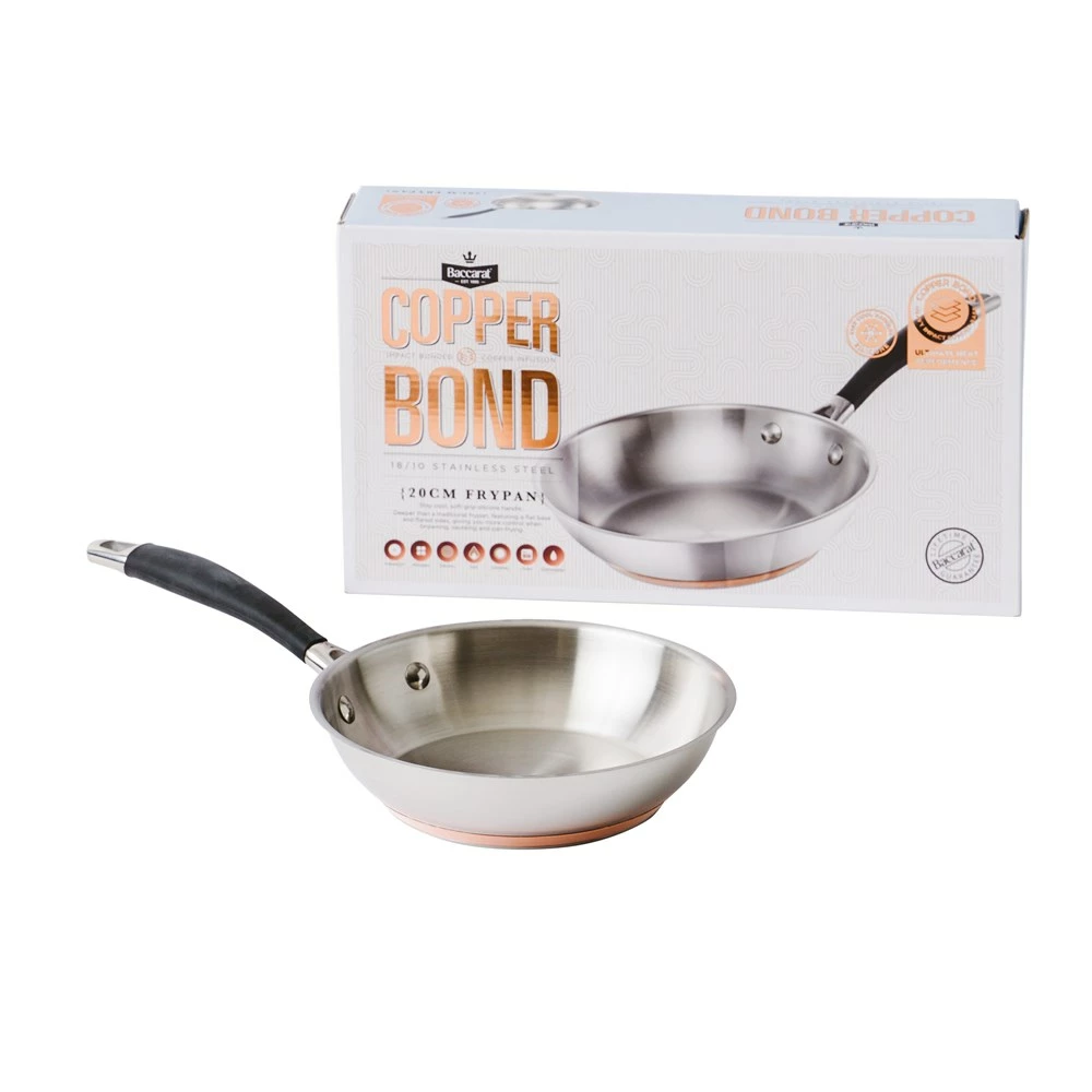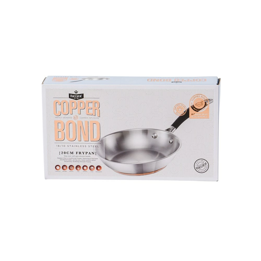 Upgrade your cookware with the Baccarat Copper Bond Frypan 20cm. Boasting a 18/10 stainless-steel body and interior, this frypan also has a heavy impact copper bonded based construction. This cookware features an impact bonded base to give the best possible attachment of the interior copper core and stainless-steel protector to the body of the pan. It allows the copper to spread to the edges of the pan for maximum heat retention and distributed heat evenly. Providing precise cooking every time and eliminates hot spots to prevent burning in the pan?s interior corners. The Baccarat Copper Bond Frypan 20cm is deeper than a traditional frypan, featuring a flat base and flared sides, for more control when browning, sauteing and pan-frying. Suitable for use on all cooktops, including induction, as well as oven safe up to 180 degrees Celsius and dishwasher safe. Create delicious recipes with the Baccarat Copper Bond Frypan 20cm.