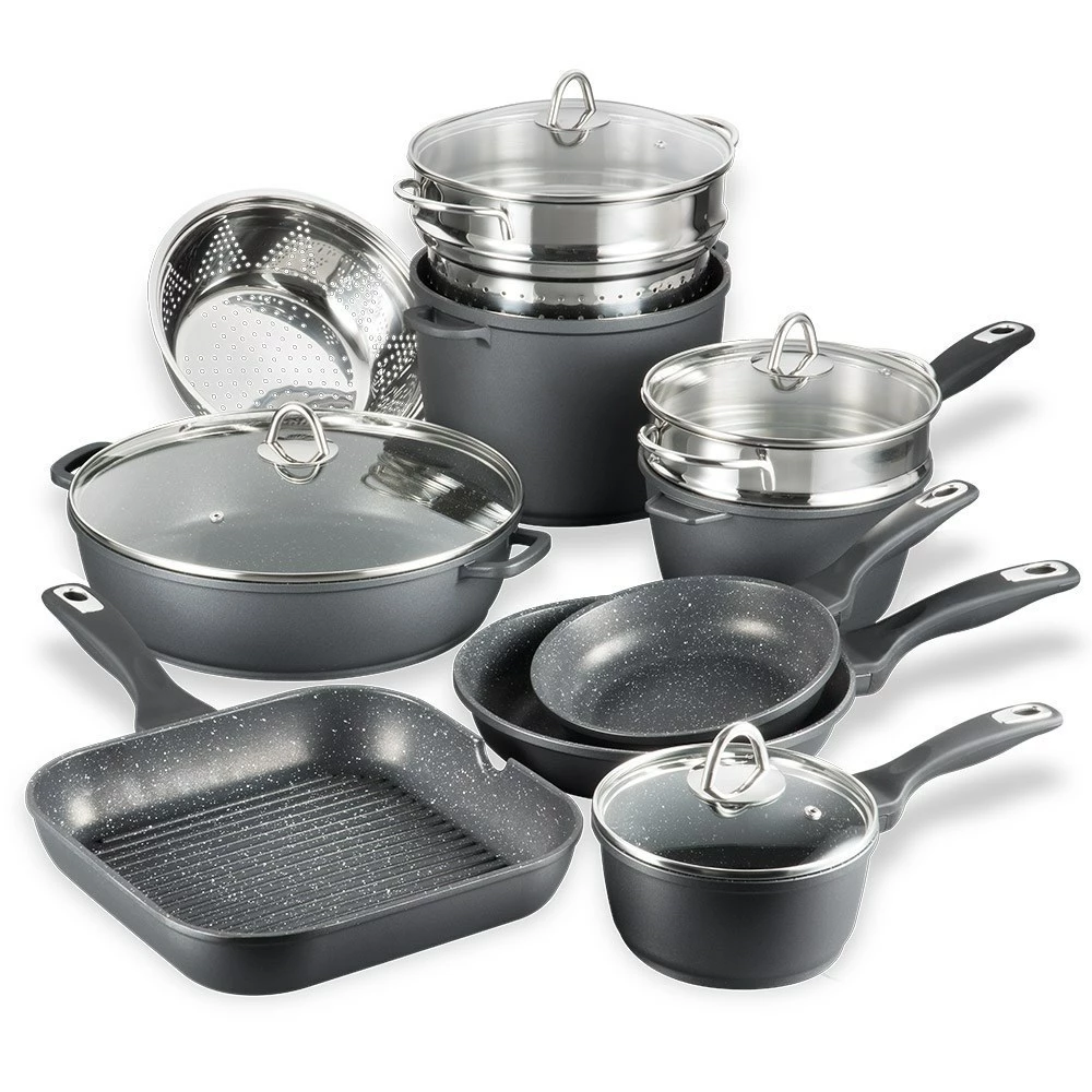 - Comprehensive cookware set is equipped with a 20cm Frypan, 26cm Frypan, 28cm Grill pan, 16cm Saucepan with lid, 20cm Saucepan with lid, 32 x 8cm Saute pan with lid, Stockpot with lid, a Pasta Insert and two Steamer InsertsÂ