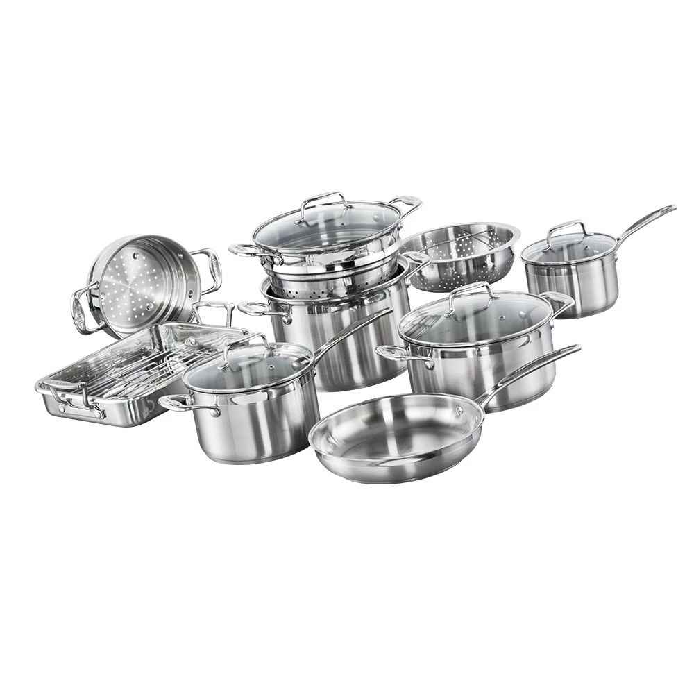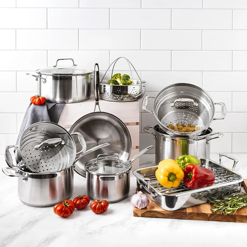 - A premium 18/10 stainless steel cookware set with a satin finish exterior surface that?s easy to clean and will last a lifetime