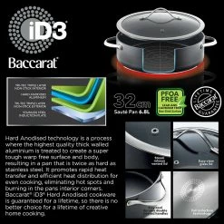 Get cooking with the Baccarat iD3 Saute Pan With Lid 32 x 8.5cm. The pan has been hard anodised to create a super tough warp free surface and body, resulting in a pan that is twice as hard as stainless steel. The pan promoted rapid heat transfer and efficient heat distribution for even cooking, eliminating hot spots and burning in the pans interior corners. The interior and exterior features a tough TRI-TEC triple layer non-stick, providing quick easy cooking, long lasting food release and faster clean up. The TRI-TEC triple layer is perfect for low fat cooking as you can use less oil. The Baccarat iD3 Saute Pan With Lid 32 x 8.5cm includes a magnetic stainless steel induction plate making the iD3 suitable for all cooktops. The pan offers the convenience of quick and easy clean up that literally rinses and wipes clean but is also dishwasher safe. Baccarat iD3 Hard Anodised cookware is guaranteed for a lifetime, so there is no better choice for a lifetime of creative home cooking.