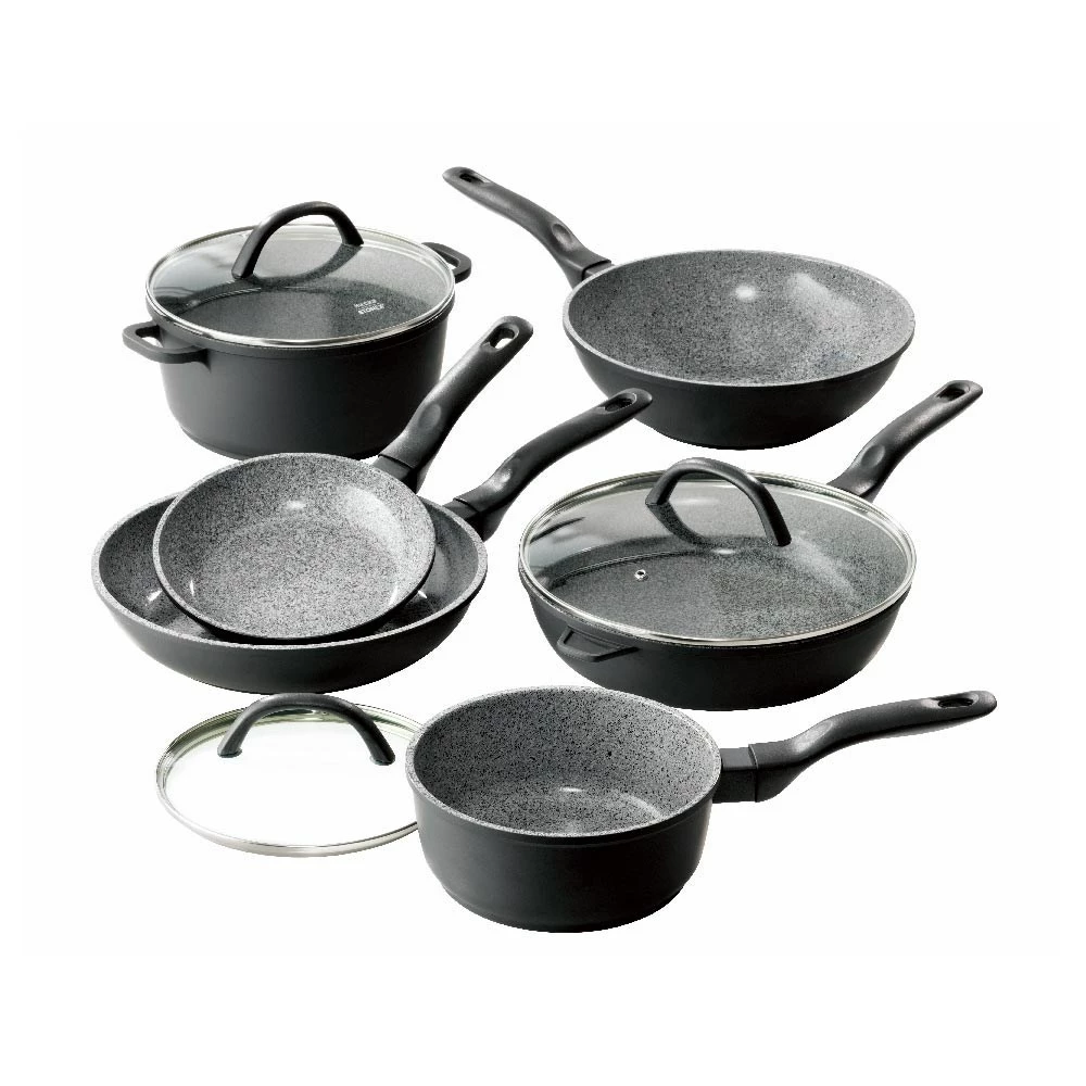 - Comprehensive set comes equipped with Saucepan with Lid: 20cm, Casserole with Lid: 24cm, Frying Pan: 28cm, Frying Pan: 20cm, Saute Pan with Lid: 28cm, Wok: 28cm