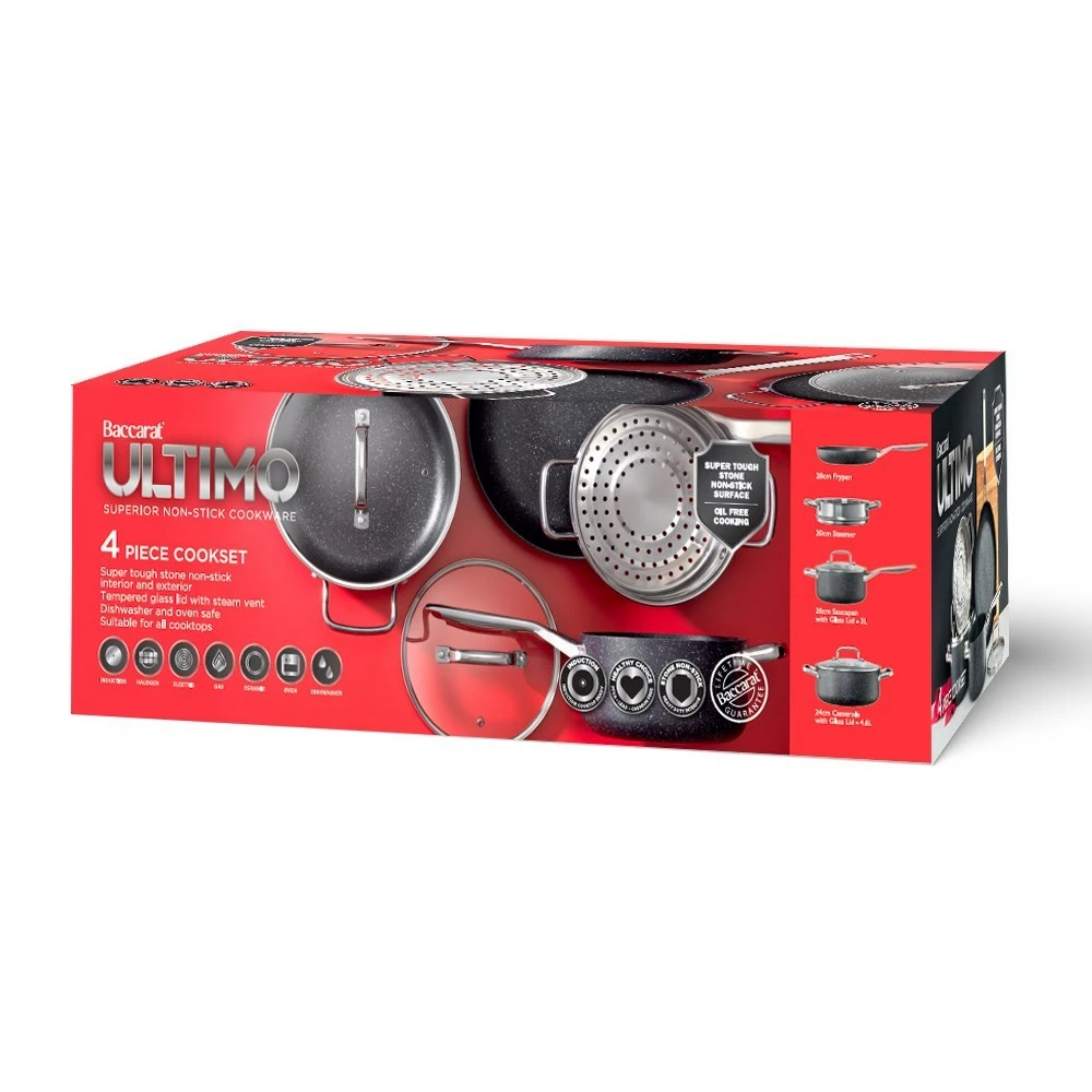 - Comprehensive cookware set consists of 1 x Frypan, 1 x Saucepan, 1 x Casserole, 1 x Steamer and is backed by Baccarat Life Time Guarantee