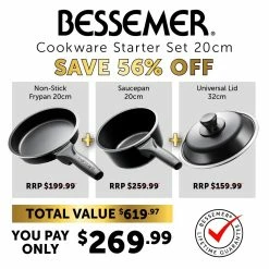 - Set includes 1 x Bessemer Non Stick Frypan 20cm Ebony, Bessemer Non Stick Saucepan 20cm Ebony, and 1 x Bessemer Universal Lid 20cm Ebony