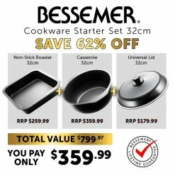 - Set includes 1 x Bessemer Non Stick Casserole 32cm Ebony, 1 x Bessemer Non Stick Roaster 32cm Ebony and 1 x Bessemer Universal Lid 32cm Ebony