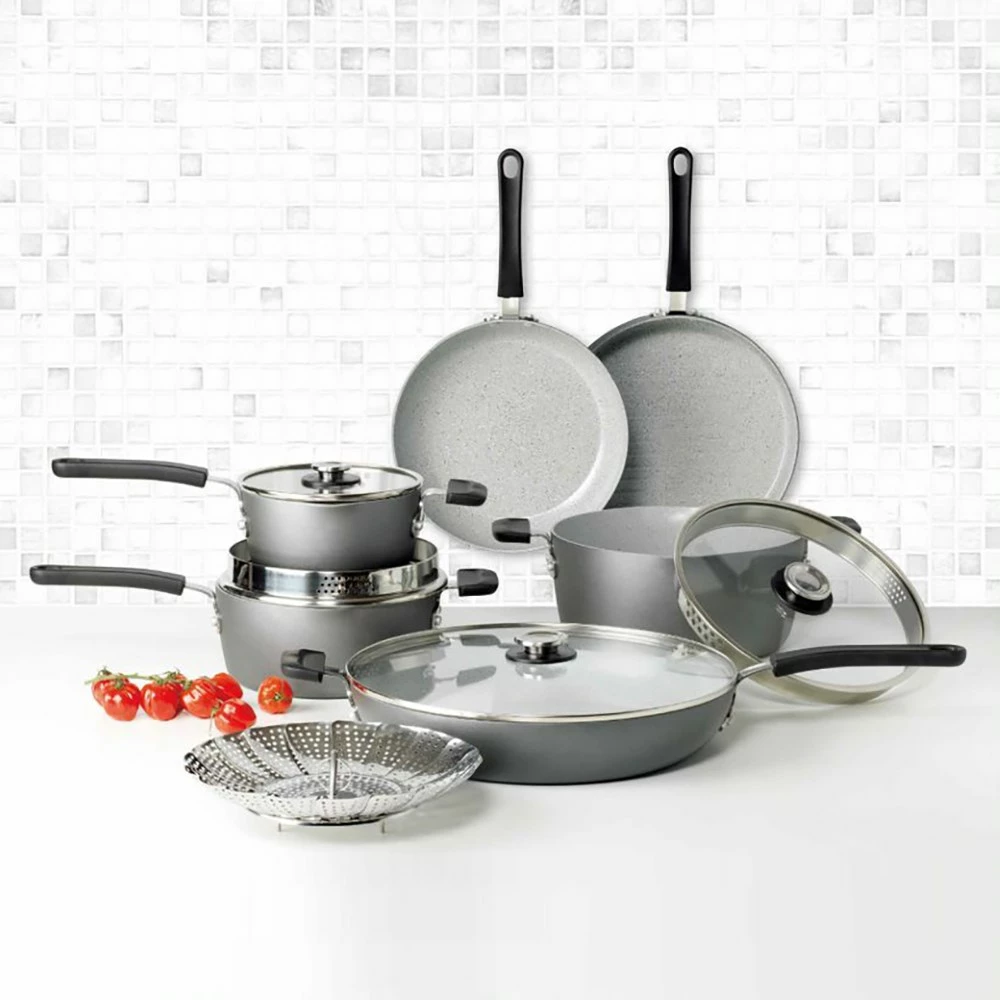 - The cookware set includes 1 x Casserole, 2 x Suacepan 2 x Frypan, 1 x Grill pan, 1 x Flower Steamer, 3 x Pot protectors