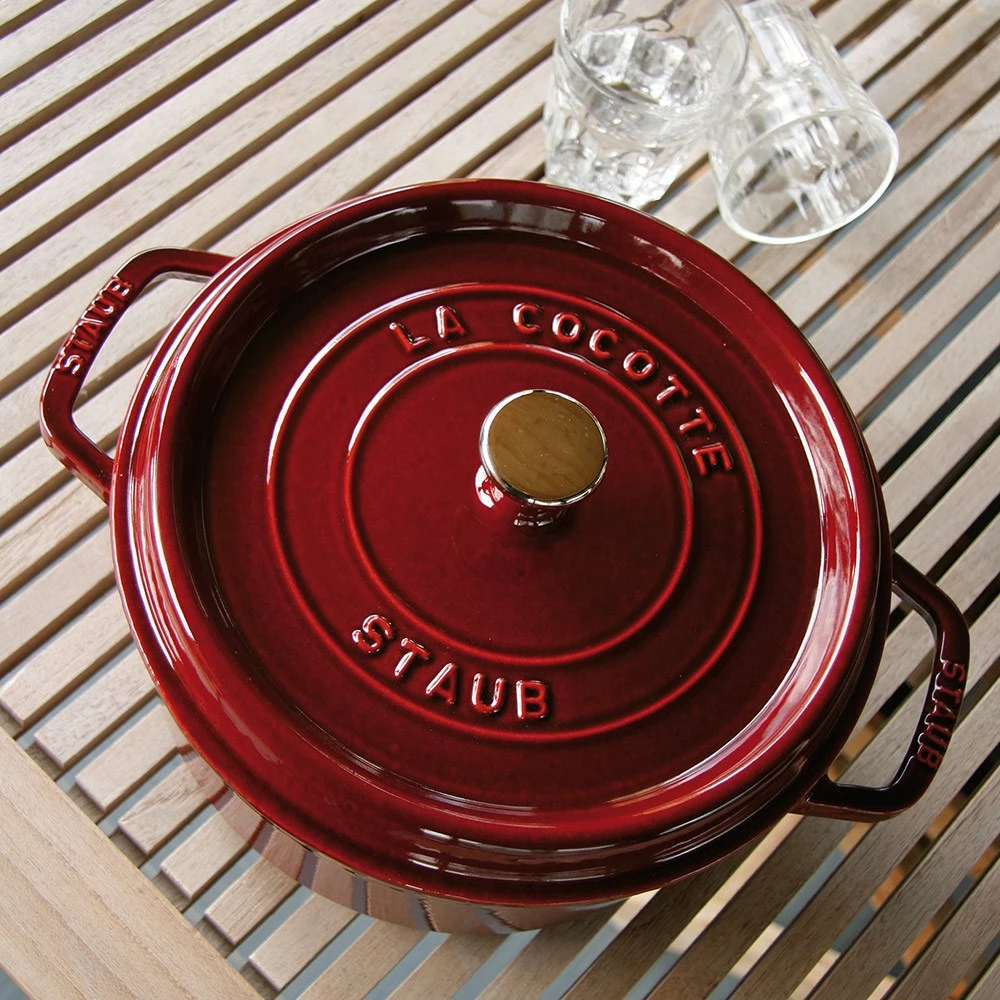 Enhance your culinary collection and create a variety of delicious casseroles, stews, roasts and more with the enamelled cast iron Round Cocotte 24cm/3.8L by Staub!