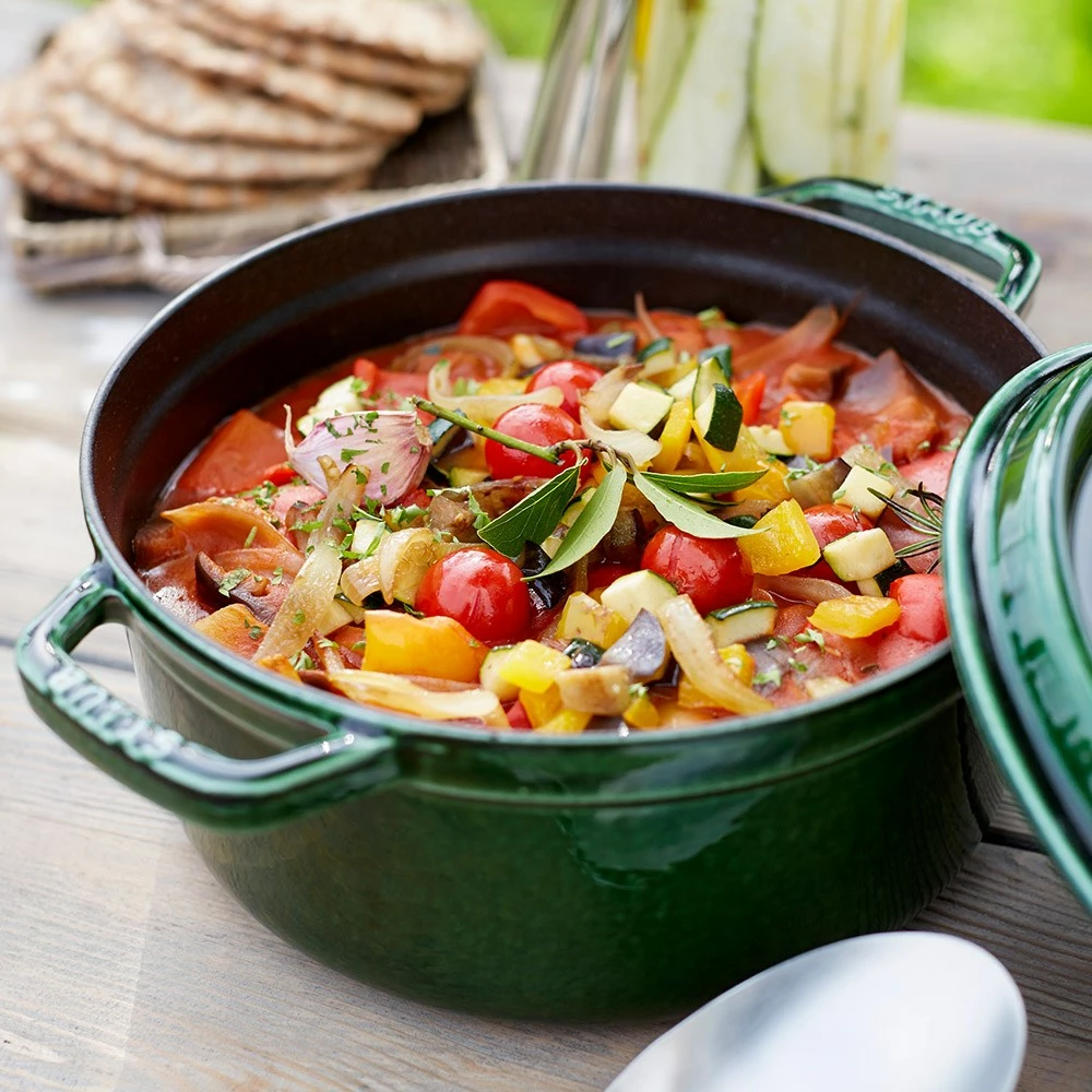 Expand your culinary repertoire and create a variety of delicious, flavoursome meals with the versatile Round Cocotte 28cm/6.7L by Staub! Expertly crafted from heavy duty cast iron, this cocotte is designed to deliver exceptional heat retention and an even distribution of heat to achieve delicious results with every use. It boasts a sleek, glossy enamelled exterior in vibrant basil green and is perfect for oven to table use to show off your delicious culinary creations. Made in France, this Round Cocotte offers a generous capacity of 6.7 litres and is the perfect cookware for creating delicious braised or roast dinners for the whole family to enjoy. Equipped with a heavy, tight-fitting lid, the Round Cocotte by Staub ensures that juices are evenly distributed to keep contents moist and flavoursome throughout the cook. Prepare and present your mouth-watering culinary creations with the versatile and long-lasting Round Cocotte 28cm/6.7L by Staub!